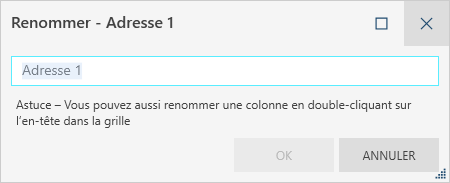 Sélectionnez Colonne > Renommer la colonne. Une boîte de dialogue s’affiche et vous demande d’entrer un nouveau nom :