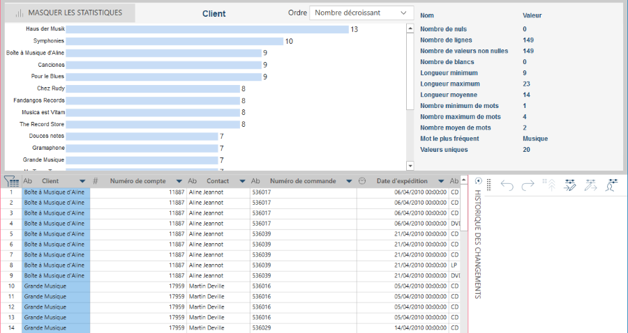 Dans cet exemple, on affiche les statistiques de la colonne Client :