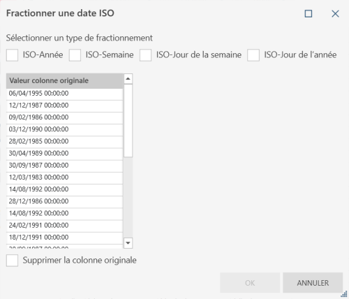 Dans cet exemple, Embauche est la colonne date/heure d’origine. Nous avons fractionné cette colonne en deux colonnes, en fonction de l’année ISO et de la semaine ISO, pour obtenir EmbaucheISOAnnée et EmbaucheISOSemaine.