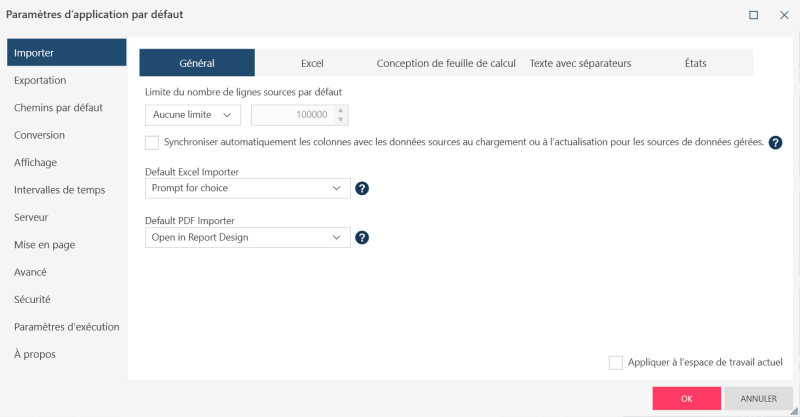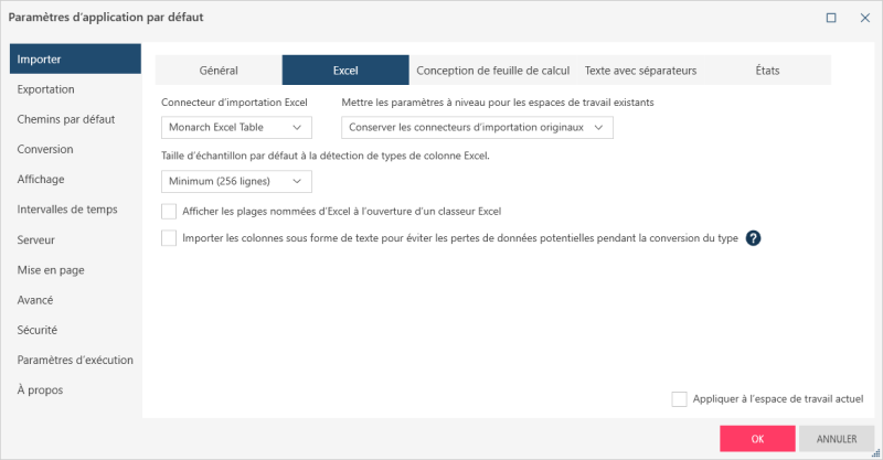 Ces paramètres permettent de spécifier les options applicables à l’importation de nouvelles données en provenance d’Excel.