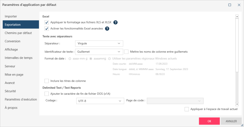 Format de date (avec option d’utiliser les paramètres régionaux Windows actuels) – Vous ne pouvez configurer ce paramètre que si l’option Texte avec séparateurs / XML > Mode compatibilité anciennes versions – Omettre les personnalisations de format à l’exportation est sélectionnée.