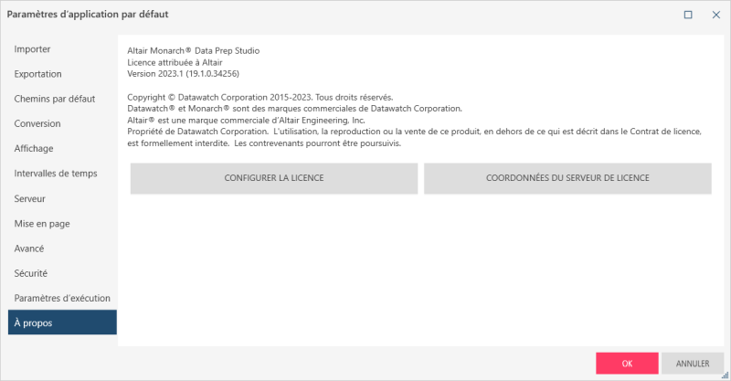 Affiche des informations pertinentes relatives à votre application Monarch Data Prep Studio, notamment le numéro de version et les avis de copyright d’Altair et de Datawatch.