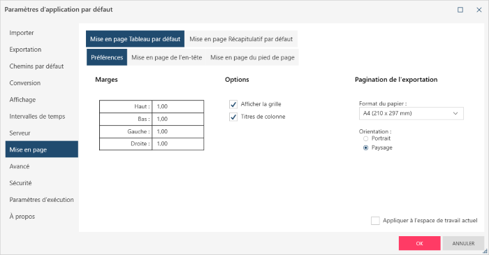 Vous pouvez spécifier les paramètres d’en-tête et de pied de page pour les tableaux et les récapitulatifs et les appliquer à tous les tableaux/récapitulatifs de l’espace de travail actuel.Cochez la case Appliquer à l’espace de travail actuel pour appliquer tous vos paramètres à tout espace de travail ouvert.