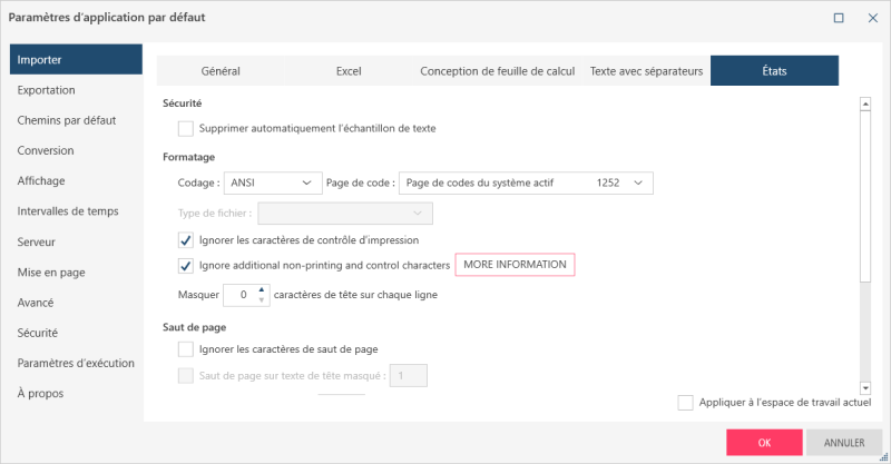 Les caractères Unicode® figurant dans cette liste sont connus comme pouvant causer des problèmes d’alignement avec le système de capture des données basé sur la position dans la vue Conception d’état. Ces caractères sont, par exemple, U+008D (saut de ligne inverse), U0080 (caractère de remplissage), U+200B (espace de largeur nulle) et U+FEFF (espace de largeur nulle sans coupure). Cochez cette case pour ignorer ces caractères. |