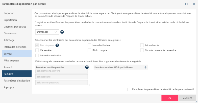 Jamais – Pour ne jamais enregistrer le mot de passe/les autres paramètres de chaîne de connexion sensibles, quand vous enregistrez un espace de travail ou une source de données.