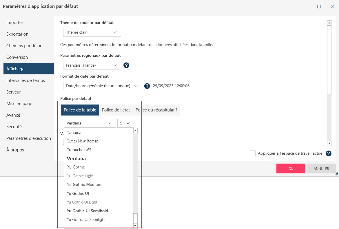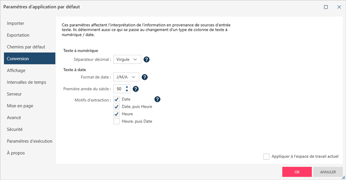 Les options « Appliquer à l’espace de travail actuel » et « Appliquer aux sources de données récentes » n’affectent pas ce paramètre.