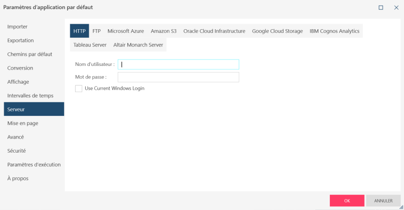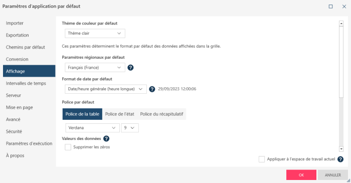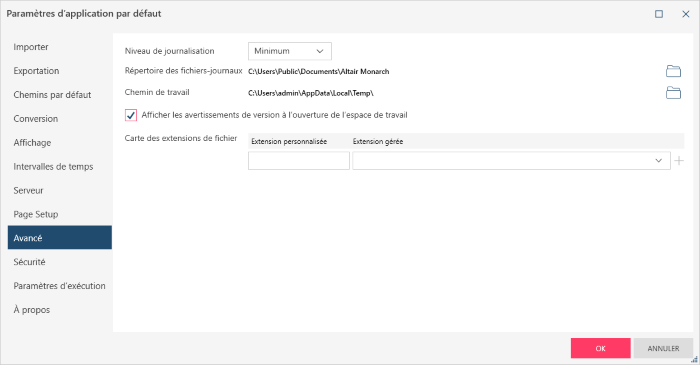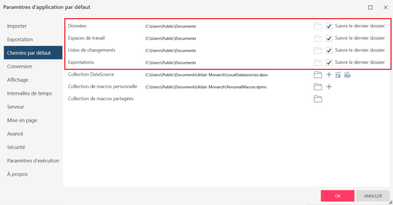 Les paramètres par défaut de l’application permettent de spécifier des paramètres de travail globaux pour Monarch Data Prep Studio.