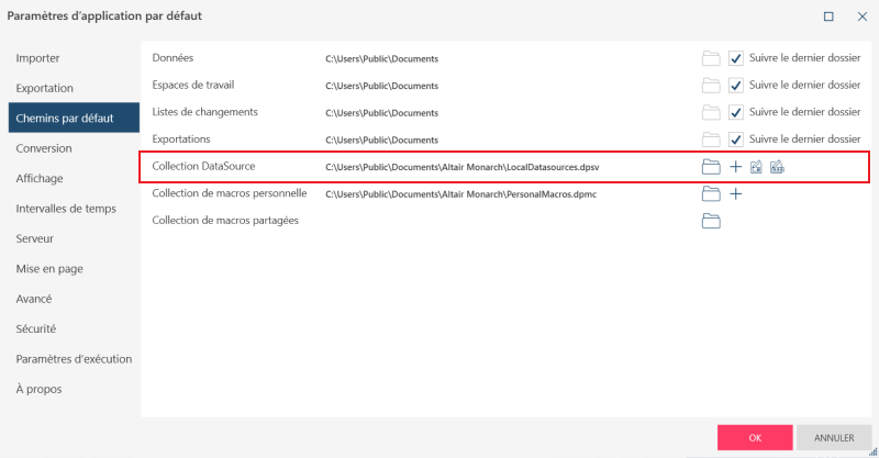 Chemin d’accès de travail – Chemin d’accès où stocker de manière temporaire les fichiers lorsque vous utilisez Monarch Data Prep Studio.