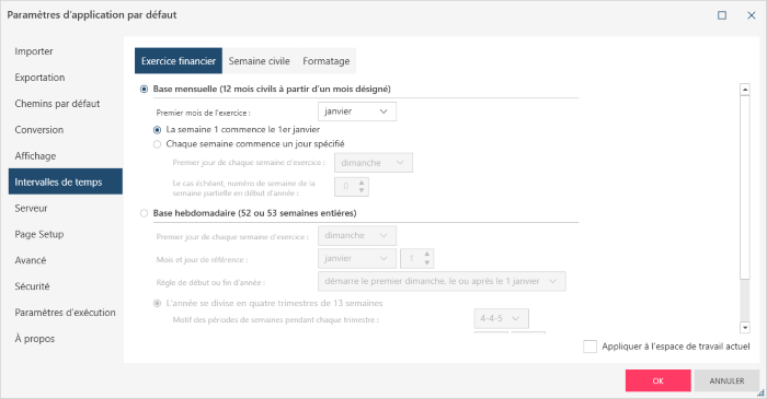 Spécifie que l’exercice se compose de 52 ou 53 semaines entières. Vous pouvez préciser le premier jour de chaque semaine d’exercice, un mois et un jour de référence, et une règle pour le début et la fin de l’année. |