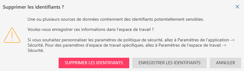 Demander – Vous demande s’il faut enregistrer le mot de passe/les autres paramètres de chaîne de connexion sensibles chaque fois que vous enregistrez un espace de travail ou une source de données. L’invite suivante s’affiche.
