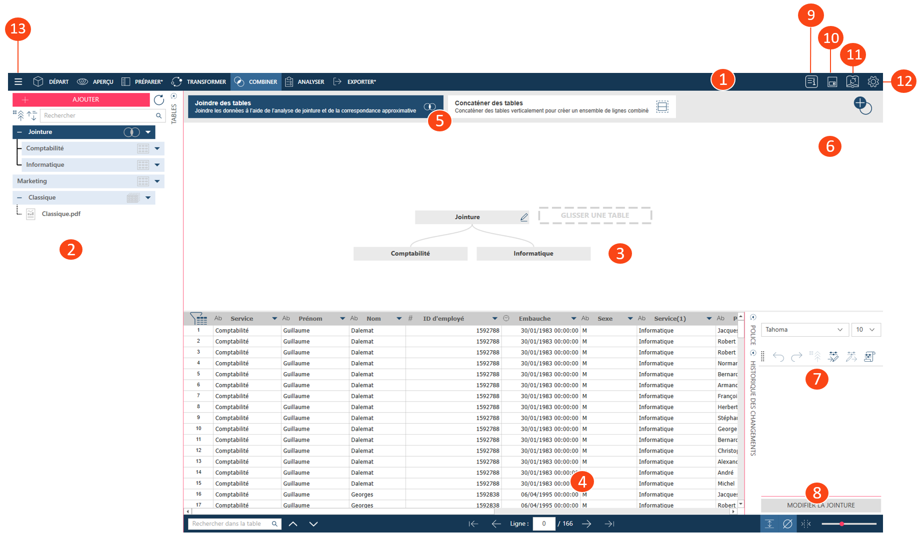 L’étape Combiner permet de joindre ou de concaténer deux tables ou plus. Vous pouvez sélectionner l’opération à effectuer dans un menu déroulant quand vous cliquez sur l’outil Combiner.