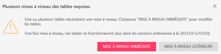 Il est possible de mettre à niveau les sources de données obsolètes des fichiers de bibliothèque comme décrit ci-dessus. Si votre fichier de bibliothèque contient des tables obsolètes, l’avertissement suivant s’affiche :