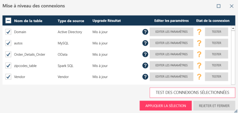 La boîte de dialogue Connexion de mise à niveau comprend les détails des tables nécessitant une mise à niveau, le type de source, le résultat de la mise à niveau et deux boutons que vous pouvez utiliser pour mettre à jour les paramètres de la source de données et tester l’état de la connexion.