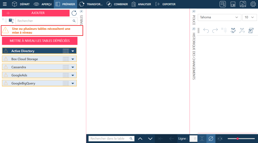 Si vous choisissez Mettre à niveau plus tard, l’espace de travail s’ouvre mais l’avertissement suivant s’affiche dans le sélecteur de table :