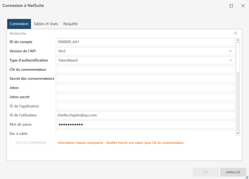 - Fournir les informations manquantes (c’est-à-dire tous les champs en gras). Des messages en bas de la boîte de dialogue vous invitent à fournir toute information manquante requise par le connecteur. Notez que si un champ obligatoire est laissé vide, vous ne pourrez pas enregistrer les paramètres de connexion ou tester la connexion. Selon le connecteur, vous pouvez également modifier les paramètres pour Tables et vues et Requête.