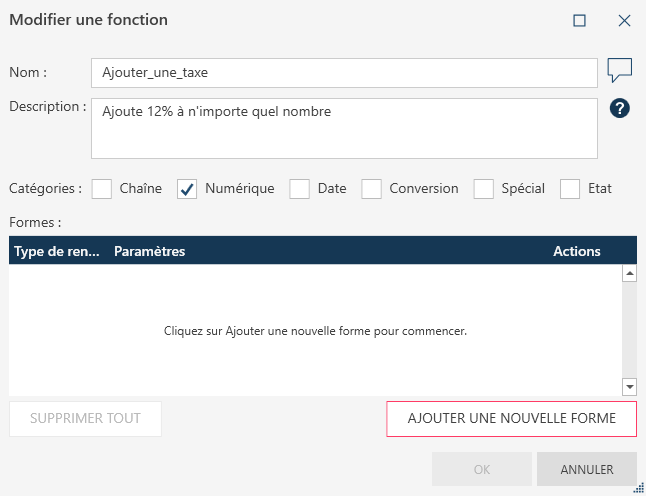 dans la colonne Fonctions. La boîte de dialogue Modifier une fonction s’affiche. - Donnez un nom à votre fonction ainsi qu’une description. L’ajout d’une description aide les autres utilisateurs à comprendre à quoi sert la fonction. Vous pouvez activer le surlignage syntaxique des paramètres à l’aide de balises de style HTML. Par exemple, si votre fonction a la forme "YearsBetween(dateDébut,dateFin)", vous pouvez formater votre description comme suit : "Renvoie le nombre d’années entre <1>dateDébut</> et <2>dateFin</2>."