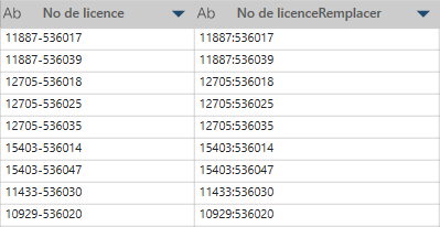 Dans cet exemple, la première colonne (No de license) est la colonne d'origine. Le caractère - a été remplacé par : dans No de licenceRemplacer.