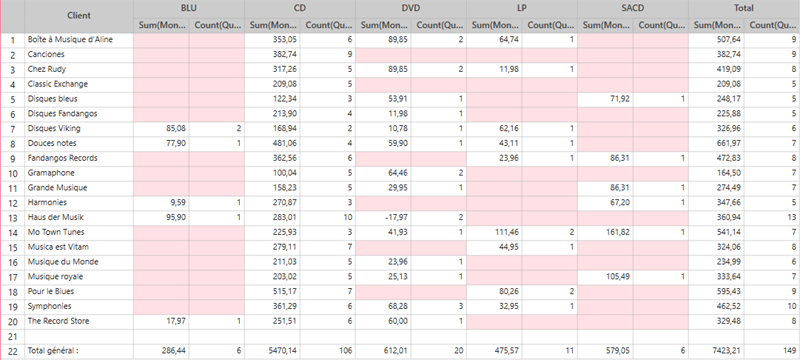 Ces deux vues sont obtenus à partir d’un seul récapitulatif dans lequel Client est défini comme ligne, Support est défini comme colonnes, et Décompte et Montant sont définis comme mesures.