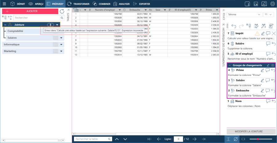 Vous pouvez importer un historique des changements dans un espace de travail. Une fois importés, les changements sont appliqués à la table active dans la fenêtre Préparer.