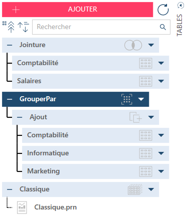 Dans la liste des tables ci-dessous, par exemple, les tables Jointure et Concaténation sont le résultat d’opérations de jointure et concaténation, respectivement.