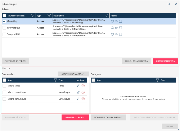 Partagées – Les macros partagées sont celles créées par d’autres utilisateurs dans leurs propres espaces de travail et enregistrées dans un fichier de collection de macros (.dpmc). Vous pouvez importer ces fichiers dans votre espace de travail et les exploiter comme s'ils étaient les vôtres.