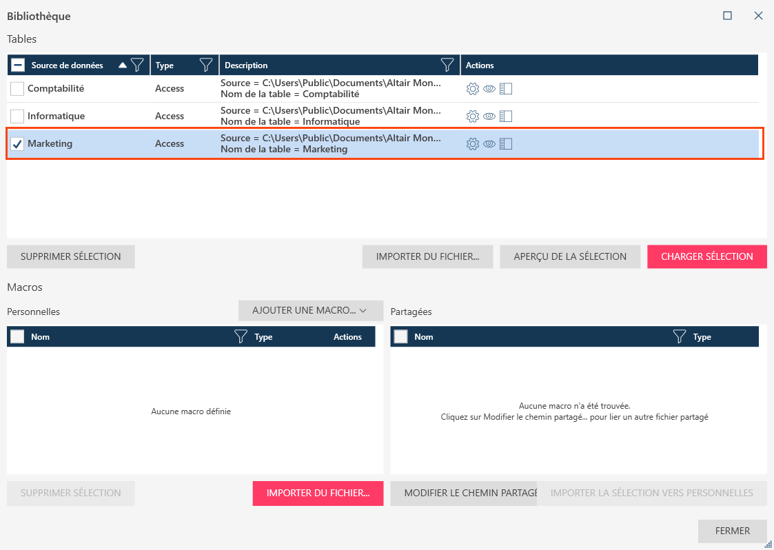 Sélectionner une source de données, puis cliquer sur le bouton Charger les tables sélectionnées dans la fenêtre pour l’ouvrir.