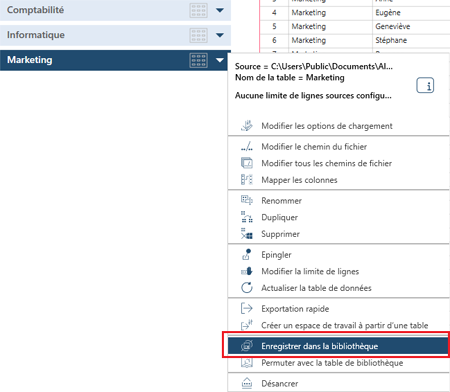 Quand vous enregistrez une source de données dans la bibliothèque, Monarch Data Prep Studio garde aussi en mémoire le chemin d’accès ou l’emplacement de la source. Vous pouvez ensuite utiliser la bibliothèque pour accéder en toute simplicité et inclure des sources de données fréquemment utilisées lorsque vous définissez des espaces de travail, sans avoir à ouvrir la source de données et à charger les tables.