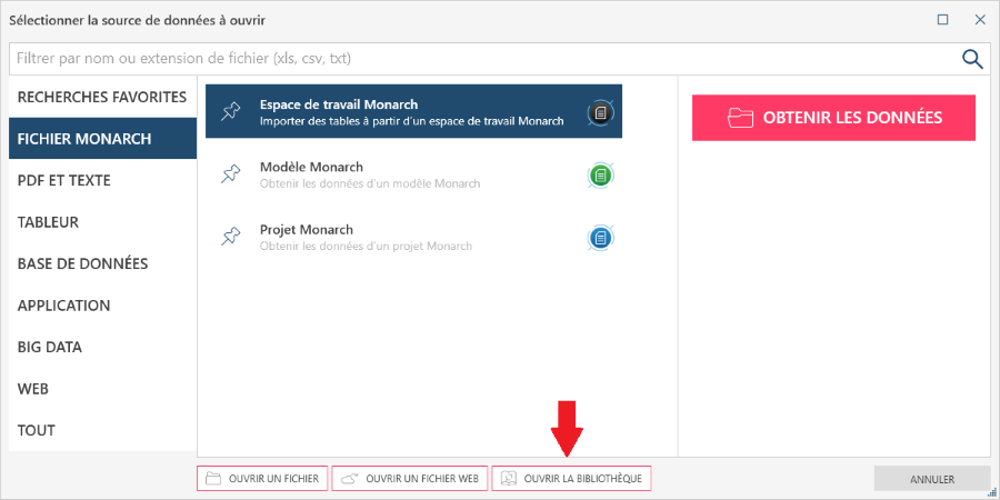 Choisissez Ouvrir la bibliothèque dans la boîte de dialogue Sélectionner la source de données à ouvrir :