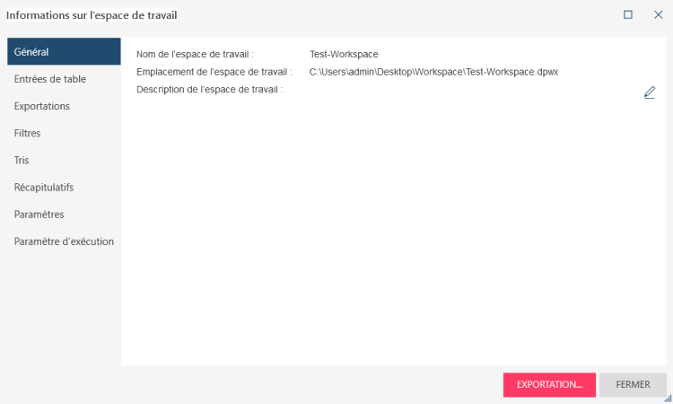 Cliquez sur l’icône Informations de la barre d’outils de Monarch Data Prep Studio pour afficher des informations sur l’espace de travail dans une fenêtre.