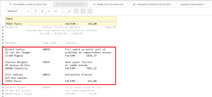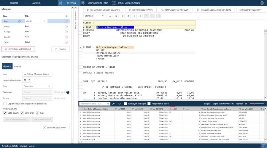 Par exemple, dans la figure ci-dessus, la ligne rouge délimite un masque d’exclusion. Ce masque permettra la capture du numéro de commande et de la date d’expédition de tous les enregistrements, même si ces détails sont sélectionnés à l’aide de deux points.