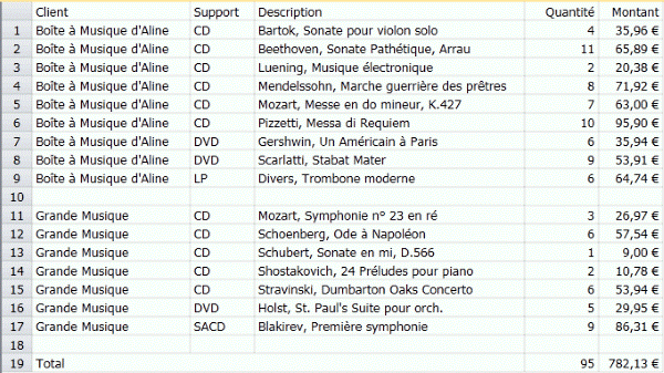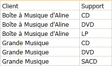 Les champs-clés génèrent la matrice récapitulative. Il vous suffit de sélectionner les champs à présenter sous forme de tableau : tous les clients ou tous les types de produit, par exemple, dans l'ordre désiré pour le détail des valeurs de champ. Pour chaque champ-clé sélectionné, Monarch Classic produit la liste complète des valeurs identifiées dans le champ. Ces valeurs sont ensuite combinées avec celles des autres champs-clés pour créer chaque ligne du récapitulatif. Par exemple, un champ Client présentant les valeurs « Boîte à musique d'Aline » et « Disques Viking » et un champ Support contenant les valeurs CD, DVD, LP et SACD produiraient les six lignes récapitulatives illustrées ci-dessous.