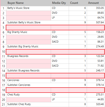 You can add blank lines to a summary to separate logical groups of information. Blank lines are added whenever the value of a selected key field changes. In the following illustration, blank lines are added after every Subtotal line.
