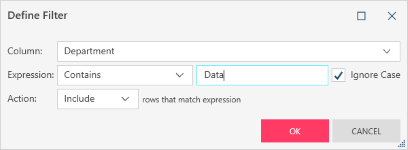 In the example below, the results of the filter defined by the image in Step 3 are displayed. Here, the original table contains the values "Accounting," "Data Processing," and "Marketing" in the Department field.