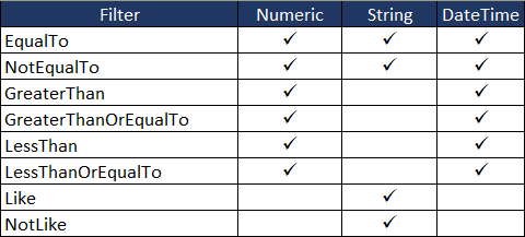 Note that all string values need to be qualified with the % sign. For instance, to set a filter to display only Last Names that start with "SMITH", define the following: LastName LIKE %SMITH%
