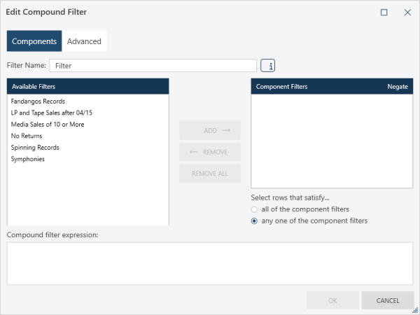 Note: In the Component filters box, you can click on any filter and mark the Negate checkbox to make it an inverse filter (i.e., using the NOT logic). The compound filter expression box will then show the updated expression.