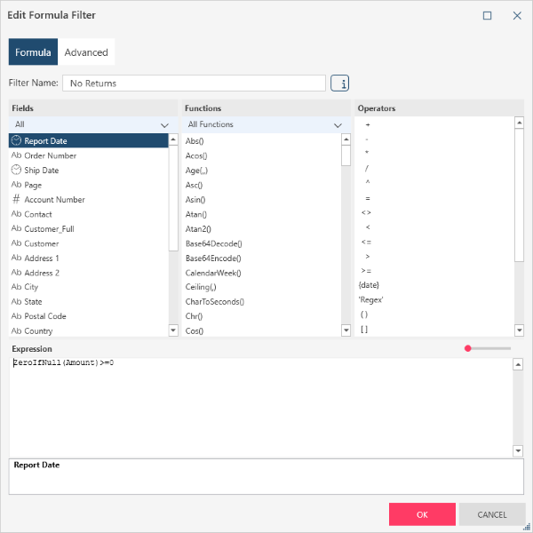 To create a formula-based filter, you create a filter expression. A filter expression is a set of rules that tells Monarch Data Prep Studio which records to display. You can think of a filter expression as a continuation of the instruction: