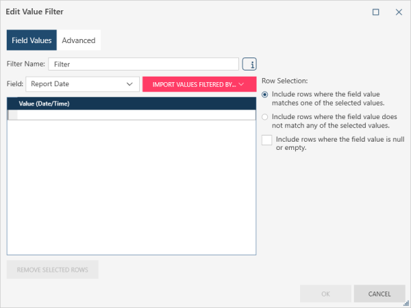 The Include rows where the field value is null or empty option presents a choice on how the filter is to deal with null (for any field type) and empty values (for Text types only). This choice is completely independent of the specified list of values (it is impossible to specify an empty string as a value). When this option is not checked, rows for which the field value is null (or empty) do not pass the filter. When this option is checked, such rows do pass the filter.