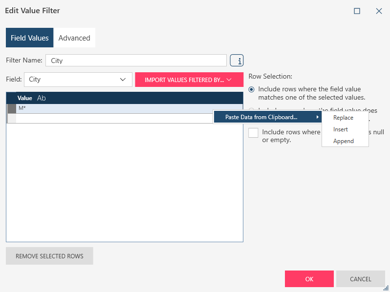 Replace: Choose this option to replace the data on the selected row with values from the clipboard.