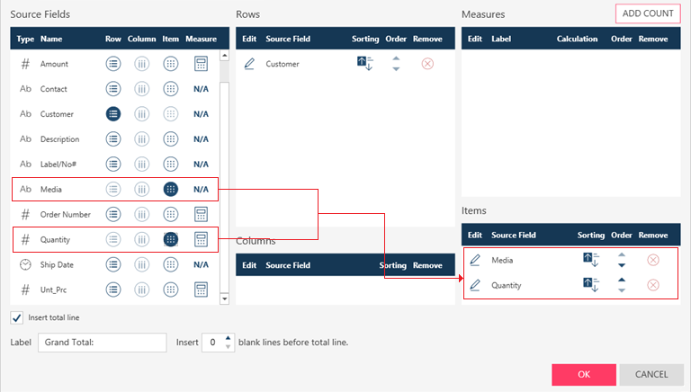 In the next example, a COUNT field was added to a summary definition in which Customer and Media were defined as a rows.