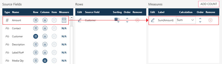 The Source Fields panel of the Add Summary dialog will list all of the columns included in the original table you selected. Beside each field name are icons for rows, columns, and measures. Note that only numeric fields can be used as measures. Click the Row icon of each field you wish to add to your summary as a row. Doing so adds the selected field to the Rows panel located to the right of the Add Summary dialog.