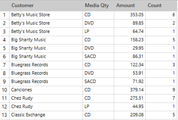 In this case, 6 records were found for Betty's Music Store selling CDs, 2 records were found for the same store selling DVDs, 1 record was found for LP sales, etc.