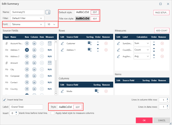 Default style: The settings here will be applied to all rows of the summary, excluding the title row and total line.
