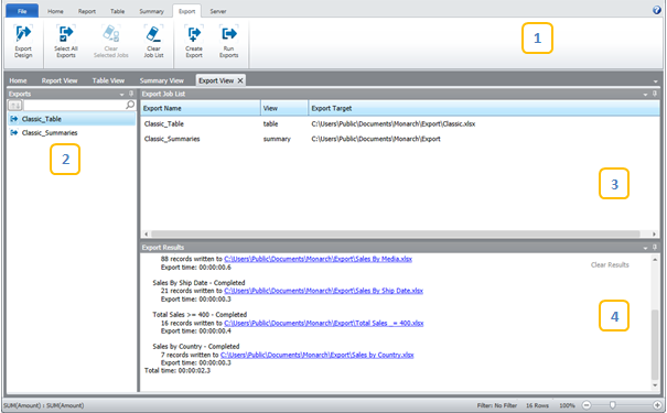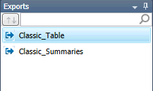 Displays all currently-selected Exports. To run all exports on this list, select Run Exports from the ribbon. |