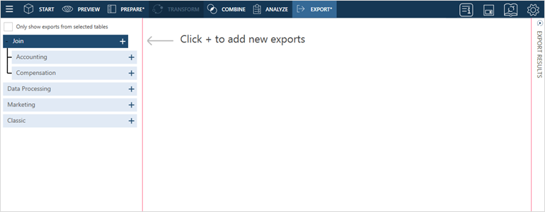This setting specifies what Data Prep Studio should do if a table or sheet with the same name you specified exists in the file you indicated in the Export As field. Select an action if the export table already exists: