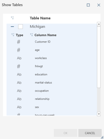 The tables displayed in the Show Tables dialog may be sorted by name by clicking on the sort icon in the header. The tables have an expander button that allows you to view a list of columns belonging to that table.