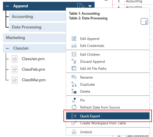 Quick Exports - These exports are set up from the Prepare window via the table list context menu or by right-clicking on a table in the Export window. Quick exports are not saved with the workspace.