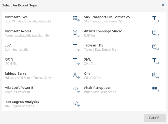 NOTE: Exports to Microsoft Power BI and IBM Cognos Analytics do not support appends to existing tables.