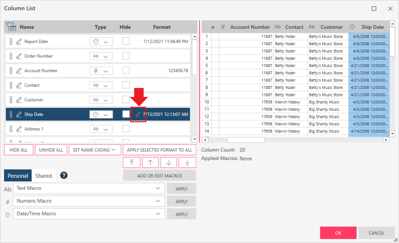 Select OK if you are satisfied with the new formatting. The Format dialog closes and you are returned to the Column List dialog.