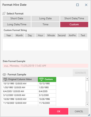 To define a custom date format by example, enter a sample custom format into the Date Format Example field. Click the Generate button to produce a sample of what your dates/times will look like when your selected formatting is applied. The format you specified is also added to the Custom Format String field.
