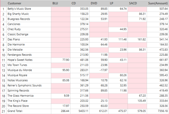 An example of this type of summary is shown in Figure 6. The Customer and Media fields are the key fields, and the Media field values are spread across the top row (columns). The Amount field is broken down into separate totals for each type of recording media. Totals for each store are displayed in the rightmost column and totals for each media type are displayed along the bottom row. The bottom right cell shows the grand total for all media types sold to all stores.